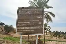 A sign erected by the Khouzestan Cultural Heritage Handicraft and Tourism Organization: "Borj-e-Ayyar Dam has been built over the Gargar Canal in order to raise the water level and deviate the water to neighbouring gardens. Much of the dam has been destroyed and eroded. There are some hand-carved structures in the rocks, known as the temple of Sabe'ein."