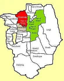 In its south-eastern corner it encloses two very small exclaves of the neighbouring townland of Borris.[2] In recent years, the village of Two-Mile Borris, whose core is in Borris townland, has expanded westwards across the townland boundary, with the result that south-eastern Garraun now contains part of the village, in the shape of a new housing area called Dún na Rí.