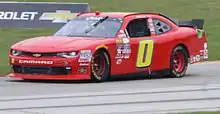On February 16, 2016, it was announced that Smithley would race for JD Motorsports, driving the No. 0 Chevrolet Camaro, and would also compete for the NASCAR Rookie of the Year honors.[12] Although the original agreement was only for three races,[13] he ran every race except the PowerShares QQQ 300. Finishing 18th in series points, he finished in the top 15 in both restrictor plate races, including one at Talladega Superspeedway. Smithley cracked the top 20 five times outside of plate tracks, but troubles at road courses (such as running the bus stop at Watkins Glen, resulting in an engine failure) put a slight damper on his season.[14] Another incident at Talladega left Chris Cockrum mad at Smithley; Smithley turned Cockrum off Turn 2, collecting Joey Gase in the process. Cockrum in the infield after the wreck accused Smithley of not knowing how to race at restrictor plate tracks.[15] Smithley, discussing his Wikipedia page in a 2018 podcast, shared his side of the story, claiming Cockrum moved up and there was only "slight contact" that led to the wreck.[16]