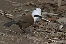 Four subspecies are identified: G. l. leucolophus or western white-crested laughingthrush, G. l. patkaicus, G. l. belangeri, and G. l. diardi or eastern white-crested laughingthrush.[3] A former subspecies, G. l. bicolor, has been re-classified as a species of its own, the endemic Sumatran laughingthrush, on account of its lack of characteristic rufous plumage, different face pattern, and shorter tail.[3]