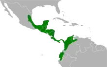 T. c. sallaei is the northernmost subspecies of gartered trogon. It is found on the Caribbean slope of central Mexico and from the Caribbean and Pacific slopes of southern Mexico through Belize, Guatemala, and El Salvador into northern Honduras and possibly into Nicaragua. T. c. concinnus is found from Costa Rica through most of Panama into western Colombia, and separately from western Ecuador into northwestern Peru. The nominate T. c. caligatus is found from the Caribbean slope of Panama's Darién Province through northern Colombia into western Venezuela. It is a year round resident in Mexico but its movements elsewhere, if any, are unknown.[2][5]
