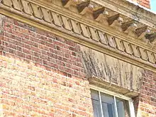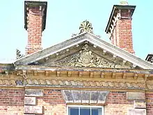 Garthmyl Hall is a two-storey, square, red brick house, five bays wide and six bays deep. It is executed in a sophisticated classical style with some Italianate and Grecian elements. Stone and terracotta dressings ornament the southeast front. Colling is likely to have patronised John Marriott Blashfield's Stamford Terracotta Company for the supply of the terracotta mouldings.[12] The centre bay projects slightly, emphasised on the ground floor with a four-column Tuscan porch, and above by a pediment that is set with a terracotta coat of arms of the Gold and Naylor families with the motto Trust in God. The deep undercutting of the foliage and roses surrounding the coat of arms is typical of Blashfield's work.[13] Below the eaves runs a terracotta scroll frieze that is similar to the frieze used by Colling on the Albany building. The hipped slate roof is set with large brick axial chimney stacks with stone caps.[14]