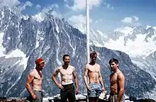 ![]() John Harlin II, Tom Frost, Gary Hemming, and Stewart Fulton at the L’Envers des Aiguille Hut in 1963. | |