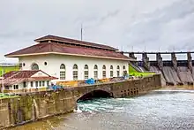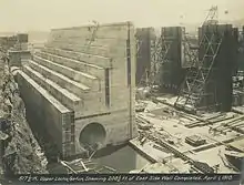 The dam incorporates a hydro-electric generating station, which is situated on the east side of the spillway discharge channel.[2] This uses water from the lake to drive a number of turbine-generators; as first commissioned, three generators were installed, producing a total of 6 megawatts (8,000 hp) of electricity. The power generated is used for the operation of the lock and spillway machinery, and for the lighting of the locks and the canal villages.[3]