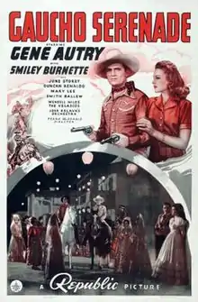 Gaucho Serenade is a 1940 American Western film directed by Frank McDonald and starring Gene Autry, Smiley Burnette, and June Storey. Written by Betty Burbridge and Bradford Ropes, the film is about a singing cowboy who goes up against a group of businessmen who plot to kidnap the son of a former partner so he won't testify against them.[2]