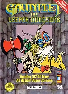Gauntlet: The Deeper Dungeons is an expansion pack for the original computer ports of Gauntlet with 512 new levels.[1][2][3][4][5][6] The player requires the original game to play the expansion.[1][3][6] Available player characters are Merlin the wizard, Thor the warrior, Thyra the valkyrie, and Questor the elf.[2][4][6]