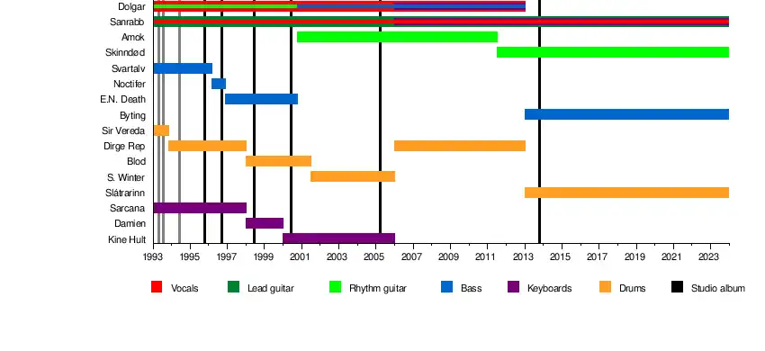 - Dolgar – bass (2000–2012), keyboards (2006–2012), vocals (1993–2012), rhythm guitars (1993–2000)