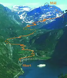 Geiranger – From Fjord to Summit (Norwegian: Geiranger - Frå fjord til fjell) is a sporting event in the village of Geiranger in the municipality of Stranda in Møre og Romsdal county, Norway. The event was started in 1994 and consists of the Geiranger Half Marathon, the Dalsnibba Cycle Race, the Geiranger March, and the Dalsnibba Minithon. All of the competitions begin at sea level at the Geirangerfjord, and all (except for the Minithon) end on top of the mountain Dalsnibba, at 1,500 metres (4,900 ft) above sea level. The annual event draws about 400-500 participants.
