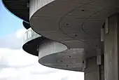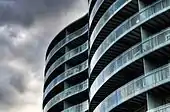 The apartments have been clipped to the exterior of the silos. The apartments have floor to ceiling windows and balconies along their entire length. At the foot of the silos, the raw concrete has been left uncovered to highlight the origin and history of the structure. This creates a marked horizontal overhang above the quayside esplanade passing below, while the narrow chasm it leaves at ground level creates a passage between dockside and streetside. Also referenced just as 'Frøsilo'