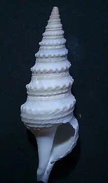 The tall and narrow fusiform shell is white with the infrasutural keel somewhat reddish. The spire is elongate and acuminate with almost vertical sides. It contains 12 whorls, showing a moderately strong subsutural square-cut fold. The concave shoulder shows 5 to 9 spiral threads. It is strongly gemmate with about 24 gemmules on the penultimate whorl. The aperture with the siphonal canal measures almost half the total length. The interior of the aperture is white. The outer lip is narrow and slightly incised. The columella stands upright and is slightly askew. The siphonal canal is elongate, narrow and slightly recurved. [2]