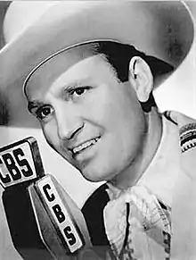 Gene Autry's Melody Ranch is a Western variety radio show in the United States. A 15-minute pilot show aired on December 31, 1939. The program ran from January 7, 1940 to August 1, 1943, and from September 23, 1945 to May 16, 1956.[1] The show's entire run was broadcast over the CBS radio network, sponsored by Doublemint gum.[2] The approximately two-year interruption resulted from Autry's enlistment in the United States Army to serve in World War II. Initially titled Doublemint's Melody Ranch,[3][4] the show's name was changed to Gene Autry's Melody Ranch in early 1941. Episodes were 30 minutes long except for a 15-minute version that ran from September 23, 1945 to June 16, 1946. The theme song was "Back in the Saddle Again".[5]