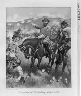 Despite this criticism, the following day was, according to Wert, one of Longstreet's finest performances of the war. After his attacks on the 29th, Pope came to believe with little evidence that Jackson was in retreat.[98] He ordered a reluctant Porter to pursue, and his corps collided with Jackson's men and suffered heavy casualties. The attack exposed the Union left flank, and Longstreet took advantage of this by launching a massive assault on the Union flank with over 25,000 men. For over four hours they "pounded like a giant hammer"[99] with Longstreet actively directing artillery fire and sending brigades into the fray. Longstreet and Lee were together during the assault and both of them came under Union artillery fire. Although the Union troops put up a furious defense, Pope's army was forced to retreat in a manner similar to the embarrassing Union defeat at First Bull Run, fought on roughly the same battleground.[72][100] Longstreet gave the credit for the victory to Lee, describing the campaign as "clever and brilliant". It established a strategic model he believed to be ideal—the use of defensive tactics within a strategic offensive.[101] On September 1, Jackson's corps moved to cut off the Union retreat at the Battle of Chantilly. Longstreet's men remained on the field to fool Pope into thinking that Lee's entire army was still on his front.[102]
