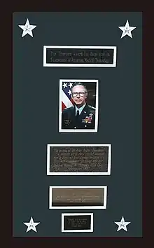 The General Maxwell R. Thurman Award is awarded on behalf of the commanding general of the United States Army Medical Research and Materiel Command at the American Telemedicine Association (ATA) annual conference in recognition of someone who exhibits and demonstrates the following qualities and attributes: a natural born leader, an innovator, someone who fosters positive change, a champion of the soldier, and a pioneer of the advancement of technology to enhance the life of our service members. The award is named after four star General Maxwell R. Thurman, who was a champion of the soldier and a pioneer of advancing technology. His famous motto, which is engraved on the award is as follows: "The mission of the Army Medical Department is to provide world class combat casualty care to America's most precious resource - It's Sons and Daughters - In Peace and War!"[1] This award was originally given out at the very first DoD "Global Forum" by its creator, BG Russ Zajtchuk in 1995 and is now an annual tradition at every ATA meeting.