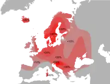 - gene frequencies (mostly due to founder effect and random genetic drift). For example, the I2a1(M26) haplotype of the Y chromosome, also present in the Iberian peninsula and in France (19% in Castile, 8% in Béarn and 6% among the Basques[33]) has frequencies of up to over 40% in Sardinia.[34] The high frequency of this haplotype among Sardinians would be due to a prehistoric migration of peoples originating from continental Europe towards Sardinia, perhaps from the Pyrenees region[33] or, alternatively, from Tuscany, through the Elba island and Corsica.[35] Haplogroup I, present in Europe since the Upper Paleolithic[36], is found among modern Europeans mainly in the Sardinian population, but in similar percentages also among those of the Western Balkans and Scandinavia.