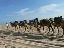 Genipabu is used for "buggie" and formerly dromedary rides. Camel rides on the dunes were popular for many years, but as of 2020 they are no longer available.[1] A sport that is played in the dunes around the lake is the "esquibunda", in which a person slides the dunes with a wooden board.