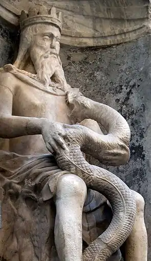 The snake symbolizes Scipio Africanus, who was helped by Palermo in the war against the Carthaginians of Hannibal. In gratitude, Scipio is said to have gifted the city with a golden basin, with a central statue of a warrior with a serpent feeding on his chest. The symbol of the serpent may have more than one meaning: it is linked to land and water, fertility, rebirth and renewal. The snake is also a symbol of prudence, antagonist of the sun, and bearer of knowledge related to physical force. In addition to the serpent, the symbology of the Genius also include a crown, a scepter and a dog.