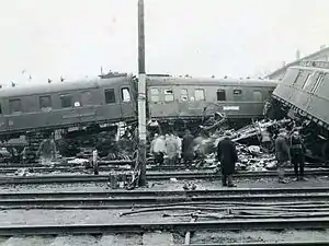 The rear four coaches of the D 10 were partly destroyed and telescoped. The locomotives and six coaches of D 180 derailed. Official figures of Deutsche Reichsbahn report 186 fatalities and 106 injured. Other sources, including the memorial, claim 278 deaths and 453 injuries.[4] Together with the 1948 BASF tank car explosion in Ludwigshafen, where 207 died and around 4,000 were injured, this is the worst railway accident in Germany.[5][4]