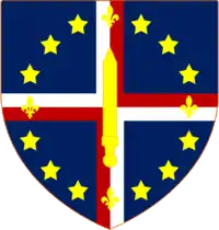 Azure on a Cross quarterly Argent and Gules between twelve Mullets in circle three three three and three Or a Sword erect in pale point upwards also Or and four Fleurs-de-lys Or