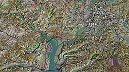 Washington, D.C. is located on the fall line, the border of two considerably different geological terrains or provinces; the hard rock of the Piedmont Plateau to the north and west and the soft sediments of the Atlantic Coastal Plain to the east. The Piedmont Plateau is located north and west of the city. Deeply cut valleys and prominent ridges characterize this area.[1]