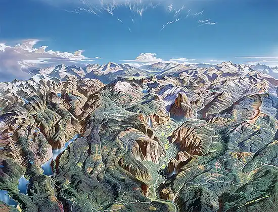 Almost all of the landforms in the Yosemite area are cut from the granitic rock of the Sierra Nevada Batholith (a batholith is a large mass of intrusive igneous rock that formed deep below the surface).[2] About 5% of the park's landforms (mostly in its eastern margin near Mount Dana) are metamorphosed volcanic and sedimentary rocks.[3] These rocks are called roof pendants because they were once the roof of the underlying granitic rock.[4]