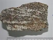 The Rayner Complex consists predominately of re‐metamorphosed Napier Complex rocks, and mafic dykes that occur only as metamorphosed remnants. The rocks of the Rayner Complex are generally of a lower metamorphic grade (upper amphibolite to granulite facies) than those found in the Napier Complex. There are however, high-pressure granulites that can be found locally.[4] Higher water pressures were inferred from observation of relatively abundant migmatitic gneisses and hydrous minerals such as biotite and hornblende, as well as the lack of mesoperthite.[5][8]