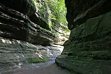 The very northwesternmost corner of the state lies in the Driftless Area, so named because it was never covered by glaciers. This area is marked by much more dramatic topography than in the rest of the state, due to the incision of the Mississippi River and subsequent reworking of river systems during the Quaternary Glaciation. In this area, vertical cliffs have been cut into the resistant dolostone of the Ordovician Dunleith formation by rivers. Apple River Canyon State Park shows some of this dramatic topography in the eponymous canyon; the tributaries of the Apple River enter the main channel pointing upstream, indicating a reversal in flow direction due to the advance of the Illinoian glacier.[12]