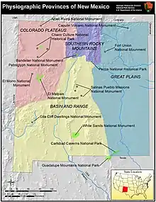 New Mexico is entirely landbound, with just 0.2% of the state covered with water,[1] and most of the state has an arid to semiarid climate.[2] Much of the state is mountainous, except for the easternmost Great Plains region.[3] The state thus has extensive bedrock exposures, which are assigned to four physiographic provinces.[4] These are the Great Plains, which makes up the eastern third of the state;[3] the southern Rocky Mountains in the north-central part of the state; the Colorado Plateau in the northwestern part of the state; and Basin and Range Provinces in the southwestern part of the state.[4] The presence of these four physiographic provinces gives the state great geological diversity.[5][6]