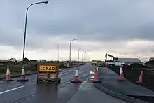 Entrance road to Grindavík closed in November 2023, because of road damage by tectonic movements and eruption risk in the area