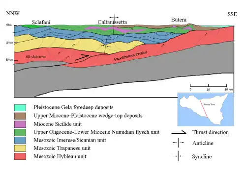 The central to western part of Sicily is made of the Maghrebian-Apenninic orogen and represents the fold and thrust belt of the subduction system. A combination of frontal accretion and low-angle detachments formed the present geological structure.[11] The orogen consists of a stack of detached nappes that involves mostly the Mesozoic carbonate, which has subsequently been folded into a syncline, underlying a broad anticline of the Caltanissetta area.[12]