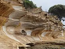 In the Rocky Cape Block west of Wynyard and north of Granville Harbour, the Precambrian rocks consist of the Rocky Cape Group from the Stenian period, with Cowrie Siltstone, Detention Subgroup, Irby Siltstone, and Jacob Quartzite.[4] The sequence covers most of the block and is over 5700 metres thick. Currents travelled either northwesterly or southeasterly. The metamorphic belt titled the Arthur Lineament forms the limits of the Rocky Cape Group to the south east. The Burnie Formation followed in the Tonian period south east of the lineament with greywacke and slaty mudstone, and also some basic pillow lavas. The Oonah Formation has even more varieties of rock than the Burnie formation, also including conglomerate, quartz sandstone, dolomite and chert. The Bowry Formation in the Cryogenian 780 million years ago was intruded by granite (Bowry granitoids) 777 million years ago. These have been metamorphosed to the blueschist level. In the Smithton Synclinorium the Togari Group followed with conglomerate from the Sturtian and Marinoan glaciations and dolomite marking the end of Cryogenian and on into the Ediacaran and Cambrian. The Togari group contains greywacke, conglomerate, diamictite, mafic volcanic rocks, and quartz sandstone, and mudstone. The components of the Togari Group are called Forest Conglomerate and Quartzite, Black River Dolomite, Kanunnah subgroup (containing the lavas) and Smithton Dolomite.[4] These rocks are important for determining the boundary between the Cryogenian and Ediacaran periods as they contain volcanics that can be dated and dolomites marking the end of glaciations and marking the period boundary.