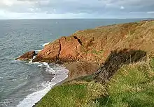 Reddish-brown sandstones of the Peel Group of early Devonian age are exposed along the coast for a mile north-east of Peel. These rocks extend for up to a mile inland but are covered by sands and gravels. The sequence, estimated to be between 500 and 2000m thick, is fluvial and aeolian in origin. It also contains conglomerates, and some concretionary limestone or calcretes which represent fossil soil horizons.[6] A scatter of diorite and lamprophyre dykes were emplaced during the early Devonian, the latter within the Niarbyl Formation rocks south of Peel. The Foxdale granite pluton was also emplaced at this time. It is worked at a quarry within the Stoney Mountain Plantation south-east of Foxdale village.