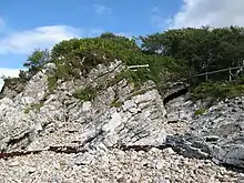 Sedimentary rocks of Mesozoic age underlie most parts of the island north of the Sleat Peninsula. They are hidden beneath Palaeogene volcanic rocks over most of this area, being exposed only on the eastern and northern coasts of the Trotternish peninsula, on the Strathaird peninsula and between the Red Hills and Sleat.[1] Triassic rocks of the Stornoway Formation are found near Broadford, a sequence of sandstones and conglomerates deposited by rivers. These beds are overlain by the lower Jurassic Lias Group with the Broadford Beds at the base, passing up into the Pabay Shale Formation, the Scalpay Sandstone Formation, the Portree Shale Formation and the Raasay Ironstone Formation. The sequence continues with the Lower to Middle Jurassic Bearreraig Sandstone Formation followed by Middle Jurassic Great Estuarine Group, comprising the Cullaidh Shale Formation, Elgol Sandstone Formation, Lealt Shale Formation, Valtos Sandstone Formation, Duntulm Formation, Kilmaluag Formation and the Skudiburgh Formation. The Upper Jurassic is represented by the Staffin Shale Formation. The only Cretaceous unit exposed on Skye is the Strathaird Limestone Formation, thought to be either Turonian or Campanian in age, which lies unconformably on the Jurassic and is overlain unconformably by Palaeocene lavas.[2]