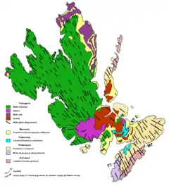 The oldest rocks found on Skye are gneisses of the Lewisian complex that were formed about 2,800 million years ago during the Archaean.[1] These gneisses outcrop on the southeastern coast of the Sleat peninsula and were originally granitic igneous rocks. Near Tarskavaig, Neoproterozoic metasediments of the Moine Supergroup are found above strongly deformed Lewisian rocks. The Lewisian and Moine sequences are thrust over another sequence of unmetamorphosed Neoproterozoic sediments, the Torridonian, along the Moine Thrust Zone. The Torridonian on Skye comprises two conformable sequences, the older Sleat Group and the younger Torridon Group. Both groups consist dominantly of sandstones and were deposited mainly by alluvial fans and rivers.