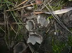 The fungus forms a rounded ascocarp underground on sandy loam soils. This fruit body remains subterranean for most of the year but breaks the surface in the spring to form a cream-coloured cup (apothecium) up to 3 cm (1.2 in) across and 3 cm tall.[1]