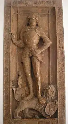 In 1499, he was ennobled and became a count. In 1502, he died in Füssen im Allgäu, allegedly poisoned with a blood sausage by his enemies. Gossembrot was buried in the chapel he had donated to the monastery of St. Magnus in Füssen. His red marble tombstone can still be seen today. Saddened by the death of his friend, Maximilian came to attend his funeral in Augsburg.[9]