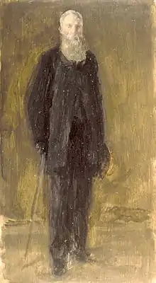 ![]() Though he frequently posed as a southern gentleman from Baltimore, Whistler was born in Lowell, Massachusetts, and, together with Lucas, attended the West Point Military Academy. He later trained in Paris in the studio of Charles Gleyre, where he befriended the realists Gustave Courbet and Edouard Manet, as well as the future impressionists Claude Monet, Edgar Degas, and Henri Fantin-Latour. In 1859, Whistler moved to London, abandoned Realism, and developed his own tonalist style of painting that used muted colors and reflected the influences of Japanese art and of the art of Diego Velázquez (1599–1660). | |