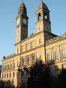 By his will Clark left £20,000 for scholarships at Glasgow University, and £20,000 to build a town hall in Paisley. The firm of Clark & Co. subscribed a further £40,000, and the building then styled the George A. Clark Town Hall was opened in 1882.[2] The architect was William Henry Lynn.[3]