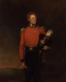 There is a portrait in oils of Hoste by William Salter, dated roughly 1834 to 1840, which portrays the colonel with red hair and ruddy cheeks, standing, holding his shako with its white and red plumes and star badge, in his Royal Engineers uniform, and wearing the badges of the Companion of the Bath, the Sicilian Order of St. Ferdinand, and the Waterloo Medal.[13] It is one of eighty-one studies made by Salter for a grand group portrait of the 'Waterloo Banquet' held at Apsley House on 18 June 1836, at which Hoste was present.[14]