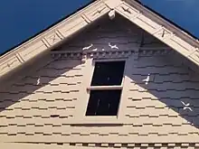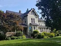 The house is two-story, four-square Late Victorian farmhouse. Although the architect of the Crossman House is unknown, it resembles the type of house that was available through mail-order catalogues in the late 19th century.[21] The house exhibits the characteristics of both the Queen Anne and Folk Victorian styles, including the asymmetrical plan, dominant front-facing gable and use of patterned wood shingles (now asphalt), weatherboards, and projecting bays. The house sits on a fieldstone foundation and has a cross-gable roof. It features an original wraparound front porch with turned posts and balusters.[22]