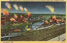 During the previous year, however, Wick and Campbell pooled resources with other local investors who wanted to maintain significant levels of local ownership within the city's manufacturing sector.[6] The group established the Youngstown Sheet and Tube Company with $600,000 in capital[3] and eventually turned it into one of the nation's most important steel producers.[7] Wick, who emerged as the steel company's first president in 1900, appointed Campbell as secretary. Two years later, Campbell rose to the position of vice president; and in 1904, he began his long tenure as president of Youngstown Sheet and Tube.[8] Wick, meanwhile, was forced to take an extended leave of absence because of health problems, though he returned to the company a few years before his death.[5]
