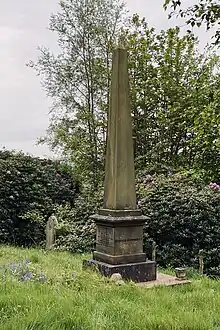 The people of Blackburn commissioned a monument to Dewhurst at the cemetery and in April 1858 the Blackburn Standard reported that it had been erected. It was the first public monument in the cemetery at that time, completed by the builder John Hacking and about 17 feet in height.[12] It was reported that when first erected the monument was "conspicuous from a considerable distance".[13]