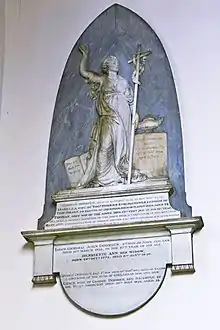 Grace died on 29 November 1826 and George Dorrien died on 10 February 1835. They were laid to rest in the family crypt in the Church of St Peter, Great Berkhamsted, where their names are inscribed on a white marble wall monument in the north transept commemorating nine members of the older Dorrien family, designed by the sculptor John Bacon the Younger. George Dorrien's heraldic achievement is also visible in the adjacent stained-glass window by James Powell and Sons.[1][2]