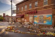 Local unrest in Minneapolis–Saint Paul immediately after Floyd's murder was the second most destructive to property in United States history, after the 1992 Los Angeles riots,[15] but peaceful protest gatherings at the street intersection in late May 2020 were free of property destruction, arson, and looting that characterized other local demonstrations.[16][17] The intersection became a place of pilgrimage for many people protesting Floyd's murder and other forms of racial injustice.[18] However, in the weeks and months after Floyd's murder, the neighborhood surrounding the square, which had previously held a reputation for gang activity, continued to have elevated levels of violent crime and regular gunfire incidents.[18] By August 14, 2022, seven people had been killed by gun violence at or around the square since Floyd's murder,[19][1][20][21][22][23][24] and one person had died there as the result of a drug overdose.[25]