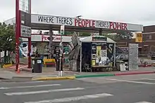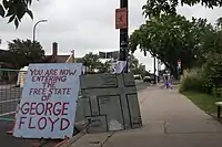 As a reaction to the murder of George Floyd on May 25, 2020, racial justice activists and some residents of the Powderhorn community in Minneapolis staged an occupation protest at the intersection of East 38th Street and Chicago Avenue with a blockade of the streetway lasting over a year.[7][8][9] The street intersection is where Derek Chauvin, a White police officer with the Minneapolis Police Department, murdered George Floyd, an unarmed 46-year-old Black man.[10] Activists erected barricades to block vehicular traffic and transformed the street intersection and surrounding structures with amenities, social services, and public art of Floyd and that of other racial justice themes.[2][4][9] The community referred to the unofficial memorial and protest zone at the street intersection as "George Floyd Square". The controversial[11] street occupation in 2020 and 2021 was described as an “autonomous” zone and a "no-go" place for police,[12] but local officials disputed the extent of such characterizations.[13][14]