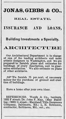 By 1891 he was also supporting himself through another enterprise. Together with Frank B. Jonas, Gibbs formed the "Jonas-Gibbs & Co." real estate firm. Frank Jonas was the son of Louisiana Senator Benjamin F. Jonas and cousin of Charles H. Jonas Jr., who married George Gibbs' sister Aline in 1893. One of the Jonas-Gibbs newspaper ads promised "We are prepared to furnish plans and estimates for buildings of every description, and to guarantee satisfaction."[18] The firm seems to have had an arrangement with "Woods & Co., bankers" to finance new construction. A newspaper account of a Jonas-Gibbs project reports the remodeling of a house on F street, including erecting a "new front of press brick and Ohio stone" and "a large iron vault" in the rear.[19]