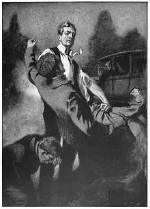 In time, Gibbs became a pillar of the community and a well-known member of Philadelphia society. When G.K. Chesterton visited Philadelphia in 1921, he stayed at the Gibbs' home.[36] The 1936–37 edition of Who's Who in America notes that Gibbs was a member of the Art Club of Philadelphia, The Franklin Inn Club, the Pegasus Club, the Merion Cricket Club and the Rittenhouse Club.[37] During Chesterton's visit, Gibbs took him to lunch at the Franklin Inn club.[38][39] In 1909, Gibbs discovered a fire in the clubhouse of the Merion Cricket Club, and helped organize a bucket brigade to put it out.[40] Gibbs participated in amateur theatrical productions, in one instance dressing in feathers to play Chanticleer: "We made it a sort of satire on modern letters, with Chantecler chasing Rostand and Ibsen haunted by his characters, and so on. It was very good fun."[14] Gibbs served on juries for many art exhibitions[41][42][43] alongside fellow artists including Frederic Remington and A. B. Frost. The 1925 Haverford College yearbook notes that Gibbs, "the well-known painter and writer of best-sellers", had addressed that school's English Club on the subject of "Writing Novels".[44]