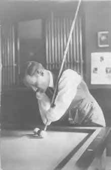 George H. Sutton (1870–1938)[2] known as the "handless billiard player",[3] was a carom billiards professional in the United States and Europe[4] in the early 1900s. He was called a "billiard expert" and he competed with other notable billiard professionals such as Willie Hoppe.[5] Sutton had no arms below the elbows, which made his ability to master the game even more remarkable.