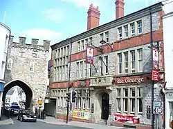 The George was established in about 1620 by Margaret Cleyton, the owner of the adjoining Gate House and many other properties in the area. It was first recorded in 1624, with the landlord named as William Jones. The George and the Gate House are positioned on either side of the town wall, and may have been linked by tunnels. In 1627 Mrs Cleyton bequeathed the inn to her daughter and son-in-law, Elinor and James Flower. During the English Civil War, several military officers staying at the inn were killed in their rooms by intruders in separate incidents.[1]