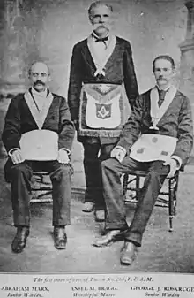 Roskruge has an extensive association with Masonry, having been called the "father of Masonry" in Arizona. He was made a Master Mason in 1870 in his birthplace of Helston, Cornwall, England. He claimed that when he arrived in Prescott in 1872, he went to the Masonic lodge there and identified himself with the secret Masonic sign. His Masonic brothers rescued his stranded traveling companions and helped him find work in Prescott.[2][lower-alpha 2][lower-alpha 3] After relocating to Tucson, Roskruge was instrumental in founding lodges there and eventually became Grand Secretary of the Royal Arch Masons of Arizona.[3]
