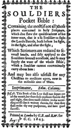 Livermore's diary shows he participated in church activities throughout his life, including being a Sunday school teacher from time to time[10] and writing hymns for Sunday school children.[10] He bought various Bibles for his library book collection.[10] About a quarter of his personal library consisted of Bibles or related Bible literature.[16] One of these was a rare copy of Cromwell's Soldiers' Pocket Bible (1643).[10] This Pocket Bible was a condensed version of the Geneva Bible, containing chiefly war-related verses to inspire the troops, as well as provide moral guidance.[10] Given the printing methods of the time, a complete Bible would have been too bulky for a soldier to carry. Livermore's copy of the 1643 Pocket Bible is one of two copies that have survived into the 21st century. The 16-page pamphlet was the first of many condensed versions of the Bible, a form that would become popular for use by military authorities and by individuals. There were only two copies of the bible in existence when Livermore's copy was sold out of his library for $1,000 in 1894 (equivalent to $33,823 in 2022).[17]